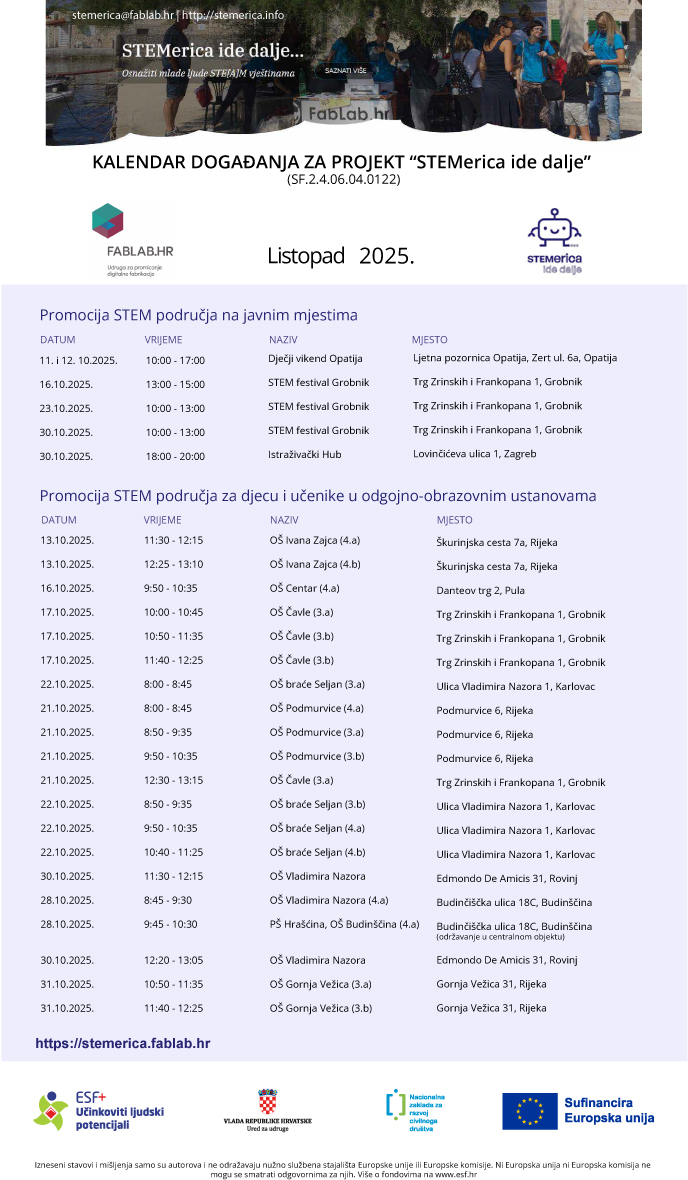 Objavljen je kalendar događanja projekta STEMerica ide dalje za radionice i javna događanja u listopadu 2025.