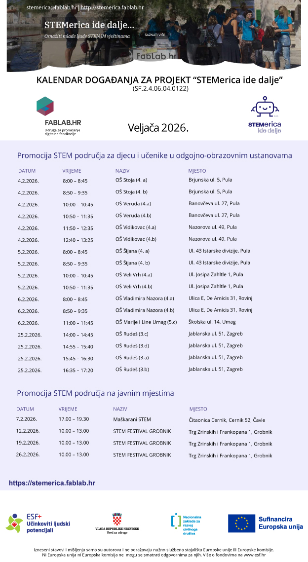 Objavljen je kalendar događanja projekta STEMerica ide dalje za radionice i javna događanja u veljači 2026.